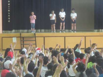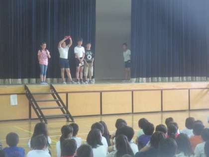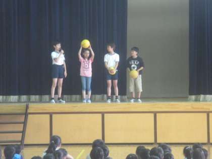 今朝の児童集会は、八幡山小学校では恒例の「これなんだろう?」集会です。体育館の舞台の上を横切る物などを当てる楽しい活動です。今年はいつもと違い、集会委員自らが身体を張って登場し、全校児童を楽しませてくれました。体育館は、物や人が通過するたびに歓声があがり、とても盛り上がりました。集会委員の皆さん、楽しい企画ありがとうございました。