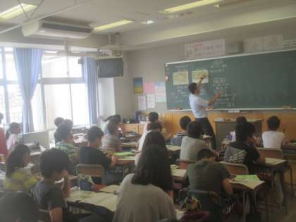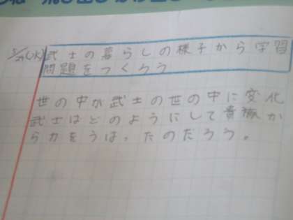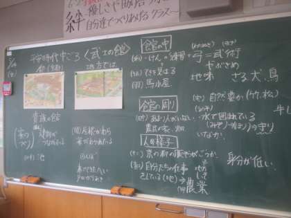 6年2組の2時間目は、社会科の歴史の学習です。「武士の政治が始まる」の単元で、貴族の寝殿造と武士の館のイラストを見比べながら、当時の武士の暮らしの様子を調べて、学習問題を作る課題に取り組みました。イラストから読み取れることをみんなで発表しながら、当時の人たちの暮らしぶりについて想像を働かせます。友だちのさまざまな意見にもしっかり耳を傾け、6年生は歴史への関心を深めていました。
