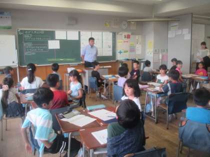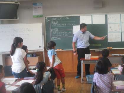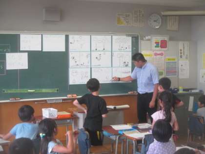 最後にグループで話し合って考えた観察方法を発表し合います。かげのでき方や向きを、太陽の位置と関係づけながら、さまざまな考え方がイメージ図になって紹介されました。先生の問いかけに、一生懸命試行錯誤しながら、3年生は1時間集中して授業に臨んでいました。素直でかわいらしい子どもたちの取組に、先生たちも熱い眼差しで参観しました。3年3組の皆さん、素敵な授業ありがとうございました。