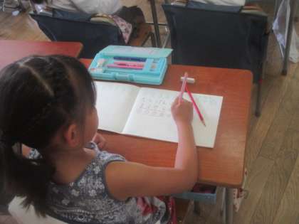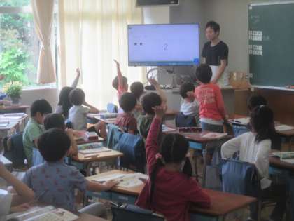 1年3組の3時間目は算数の授業。前の時間までに習った「10までのかず」の確認を、フラッシュカードで楽しく復習した後、「なんばんめ」の勉強をしました。先生の板書をしっかりノートに書いて、先生が出す問題に答えていました。たくさん手も挙がっていて、とても活気のある授業でした。