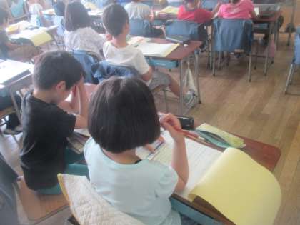3年3組の国語の授業は、説明文「米と麦」の内容の読解でした。大切な部分に線を引きながら、段落ごとに内容をおさえていきます。みんな静かに集中して、与えられた課題に取り組んでいました。