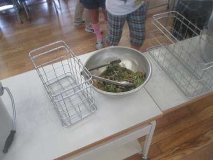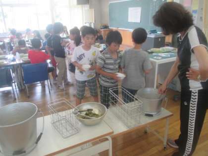 2年2組の給食の時間には、いつものようにおかわりの列ができていました。特に杏仁豆腐は大人気。でも、野菜も残さず食べてくださいね。