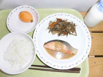 「米、鮭のごまだれかけ、きんぴらごぼう、びわ、牛乳」です。