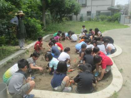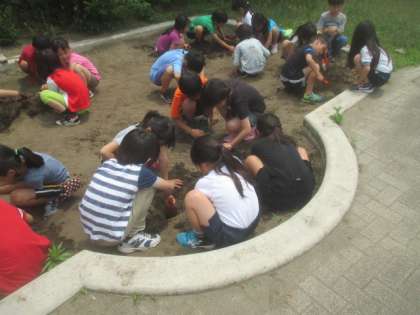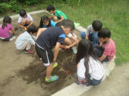 2年2組の図工の時間は、学校園の横にある砂場での活動です。砂の感触を確かめながら、自由な発想で友だちとのやりとりを楽しみます。久しぶりの砂遊びに、子どもたちも時間を忘れて楽しんでいました。