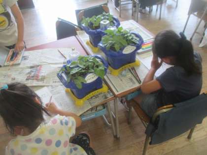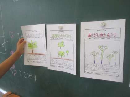 1年3組では、本葉が出たアサガオの観察が行われていました。毎日しっかり水やりをしてお世話をしているので、どの鉢のアサガオもぐんぐん生長しています。ていねいに観察カードが書けて先生にほめてもらい、みんな大喜びでした。