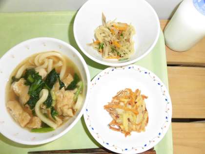 「きつねうどん、かき揚げ、かみかみサラダ、牛乳」です。