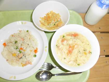 「鮭ピラフ、パリパリたっぷりサラダ、卵スープ、牛乳」です。