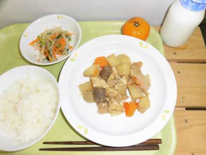 「ごはん、五目旨煮、糸寒天と野菜の和え物、冷凍みかん、牛乳」です。