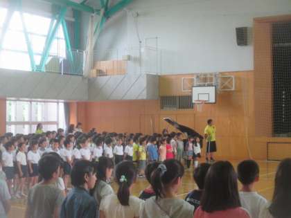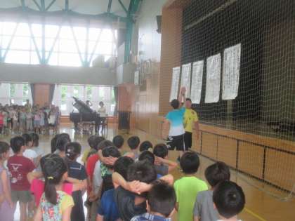 ひと月に一度の音楽町会。今日は、「あいさつは魔法の力」を全員で歌いました。先生たちの寸劇で始まり、体育館は大盛り上がり。あいさつ一つで、明るく元気に1日が過ごせるように、みんなで声を合わせて歌いました。