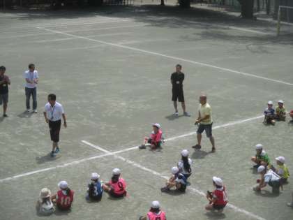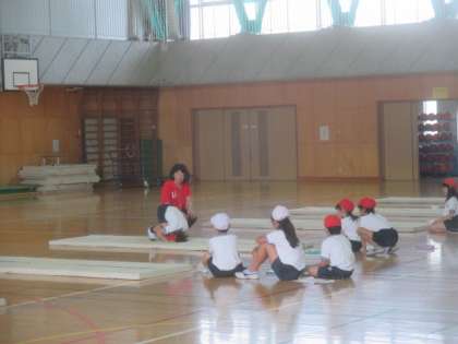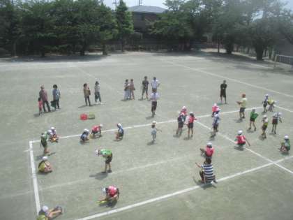 3年生の2時間目は体育の授業です。体育館では、2組がマット運動をしていました。校庭では、1組が鉄棒やしっぽとりゲームで身体ほぐしをしました。参観していたお父さんも参加し、子どもたちといっしょに盛り上がっていました。