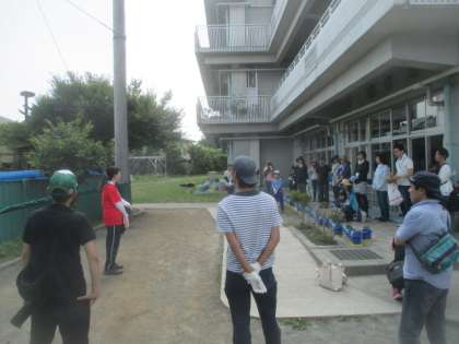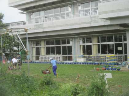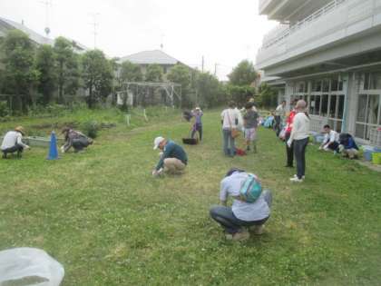 今年度も2学期の運動会に向けて、八幡山小学校運営委員会とPTAの主催で、学校裏庭の芝生の整備が行われました。今年は暑い時期の6月と7月、そして運動会直前の9月に実施します。第1回目の今回は、学級園の裏側や、インターロッキングに繁茂した草も除去していただきました。手動の草刈り機を使って、子どもたちも一生懸命手伝ってくれました。