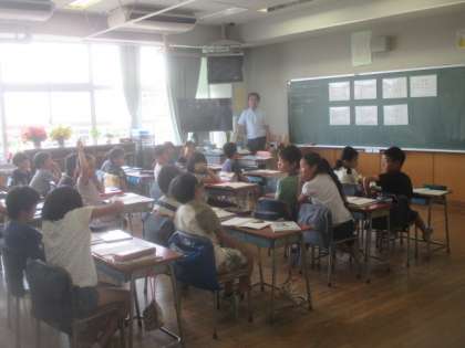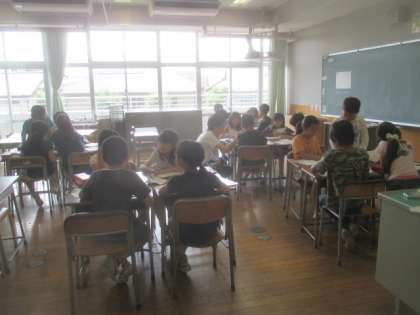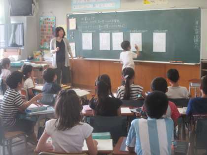 3年生の3校時は、少人数の算数の授業です。習熟度別のクラス編成で、4つの教室に分かれて指導を受けます。今日は、繰り上がりのある3桁のたし算の問題について、課題が出ていました。グループでの学び合いをするクラス、ホワイトボードで自分の考えを発表するクラスなど、さまざまな手だてで問題解決を図っていました。