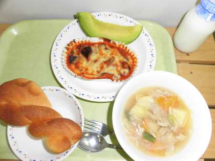 「米粉パン、茄子のグラタン、田舎風スープ、メロン、牛乳」です。