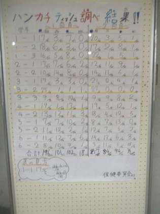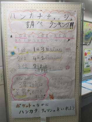 昨日の全校朝会で、保健委員会から報告があった「ハンカチ・ティッシュ調べ」のランキングが掲示されました。1回目から2回目の調査で増えた人数ランキングは、1年3組が1位でした。拍手です。でも、全員が持ってきていた3年2組は、とても立派です。これからも忘れないで、続けてくださいね。