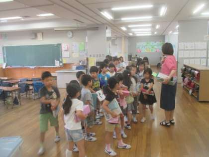 1年1組の1時間目は、講師の先生の授業です。図書室に移動するのに、全員きちんと並んで向かいます。途中でおしゃべりをしたり、列を乱したりしたらやり直しです。集団行動の大切さを厳しく指導しています。