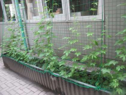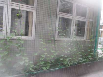 ピロティのBOP室の窓際に、今年も緑のカーテンを設置しています。蒸し暑く、雨の多いこの時期にぐんぐん伸びています。さらに成長し、夏の日差しをさえぎって、早く私たちに涼を届けてほしいです。