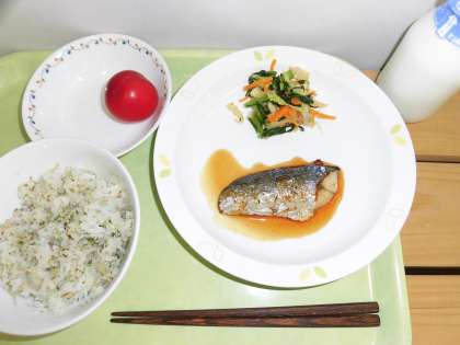 「じゃこと青のりのごはん、鰆の梅肉焼き、野菜のおかかかけ、プラム、牛乳」です。