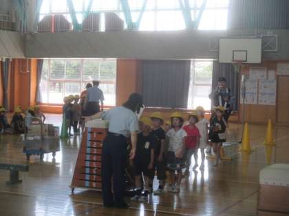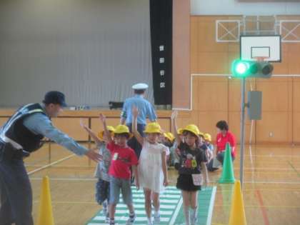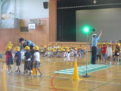 今日の2校時、体育館で1年生は交通安全教室を行いました。成城警察の方々から、横断歩道の渡り方などの基本的な交通ルールについて教わりました。体育館に信号機や標識などが設置されて、実際に渡る練習もしました。
