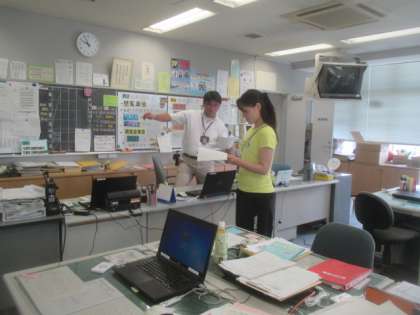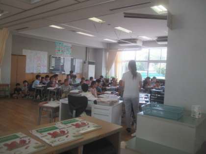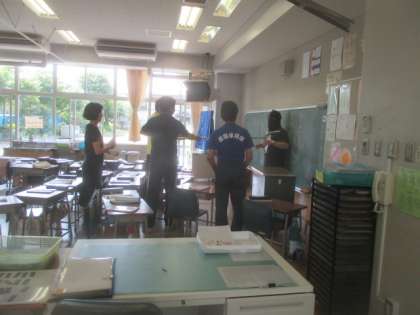 今月の避難訓練は、年に1度は必ず実施する、不審者対応の訓練です。2年生の教室に不審な人物が出没したという想定で行いました。児童を適切に誘導し、教員が協力して不審者役の職員を、実践さながらの対応で取り押さえます。職員室では、緊急110番に通報したという設定での動きも確認されました。