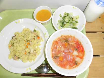 「パエリア、アスパラガスのサラダ、ミネストローネ、みかんゼリー、牛乳」です。