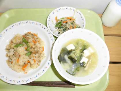 「とりめし、野菜のごまだれかけ、豆腐汁、牛乳」です。