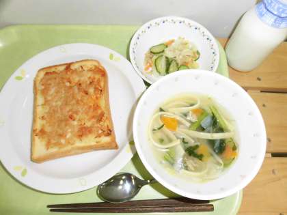 「ツナトースト、牛蒡チップサラダ、ヌードルスープ、牛乳」です。