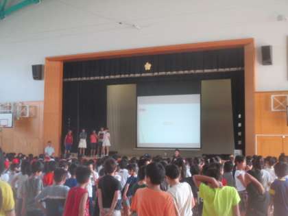 今朝の児童集会は、「これはだれ先生でしょう」集会です。スクリーンに映し出された先生の身体の一部を見て、三択で答えます。いろいろな身体の部分が映るたびに、大歓声が上がり、大盛り上がりでした。集会委員の児童の皆さん、楽しい企画ありがとうございました。