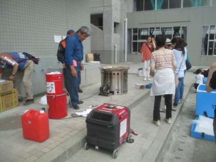 給食・物資担当の委員の方々は、発電機の操作やバーナーの組み立てなどの作業を体験しました。実際に、炊き出し用の大きな釜で湯を沸かし、備蓄用のアルファ米を炊きました。火力の強いバーナーなので、あっという間に沸騰し、参加者の皆さんで協力して、ご飯の配布の準備をしました。