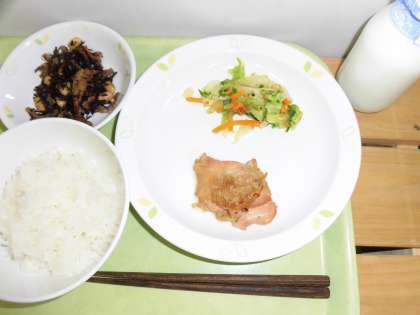 「ごはん、鶏肉の南蛮焼き、野菜の即席漬け、ひじきの煮付け、牛乳」です。