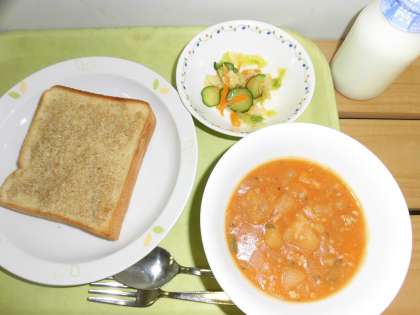 「セサミトースト、ハンガリアンシチュー、イタリアンサラダ、牛乳」です。