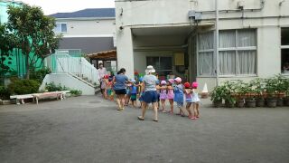 水着に着替えたら、園庭に出て、ディズニーの音楽に合わせて準備体操です。楽しく身体をほぐしました。