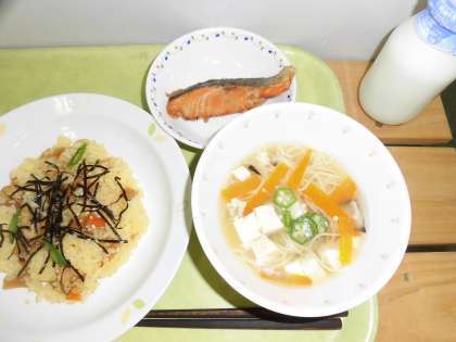 「みかん寿司、鮭の照り焼き、七夕汁、牛乳」です。