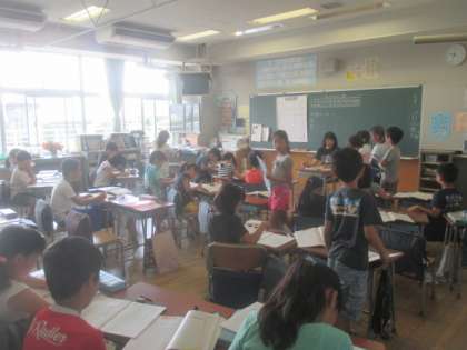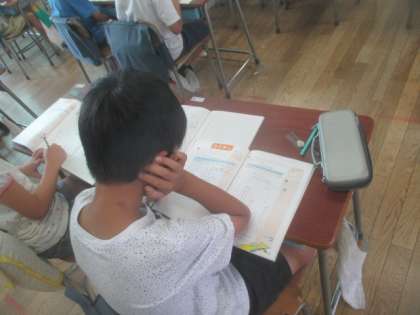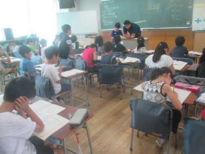 今日は土曜授業日で、午前中3時間の授業です。1時間目、3年生は算数の授業。各クラスで、1学期のまとめをしていました。教科書の章末の問題や、別刷りの復習プリントなどの課題に、どの子も一生懸命に取り組んでいました。今学期に習ったことは、しっかり復習して積み残しのないようにし、2学期の勉強につなげてほしいです。