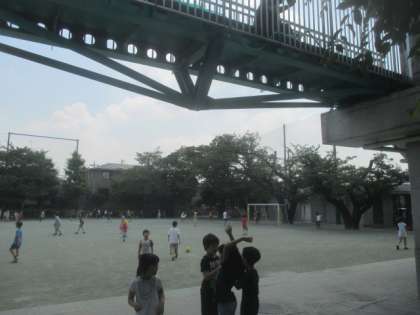 主事さんが、2階の通路にチューブを取り付け、ミストシャワーの設置をしてくれました。利根川先生がプールで発見したものを、校庭で使用できないかと考え、実現しました。シャワーの水量は少ないですが、この暑さにちょっとした「涼」が感じられそうです。