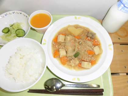 「ごはん、じゃが芋のそぼろ煮、野菜のひと塩、キャロットゼリー、牛乳」です。