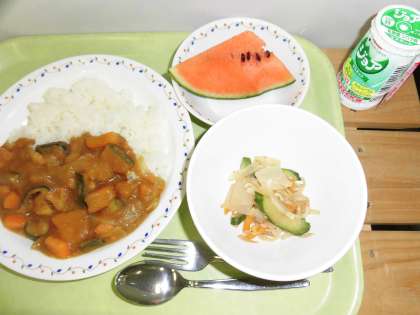 「夏野菜のカレーライス、こんにゃくサラダ、小玉西瓜、ジョア」です。