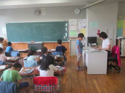 1年生の各クラスでも、1学期のまとめの勉強に一生懸命に取り組んでいました。日本語の学習のふり返りをしたり、算数の勉強の復習をしたりと、それぞれの課題に静かに取り組む子どもたちの姿が見られました。