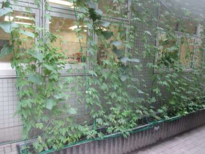 関東地方では例年より10日ほど早く梅雨明けしました。ここ数日不安定な天気が続いていましたが、雨の恵みによって、BOP室の前の緑のカーテンはぐんぐん成長しています。さらに夏の日差しを浴びて、上へ上へと高く伸びることでしょう。