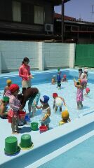 八幡山幼稚園の夏季プールは、二日目でした。プール日和で、遊具なども使って伸び伸び楽しく遊びました。
