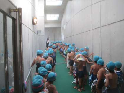 夏の太陽が照りつける中で、1回目の低学年の水泳指導が始まりました。夏の水泳指導では、担任ではない先生から教わる機会が多く、そこが子どもたちには楽しかったりもします。まず1年生が、最初の受付を上手にできて、時間通りに始めることができたのが大変立派でした。今日の1回目は、84人の子どもたちが参加しました。毎日参加することで、この夏一気に子どもたちの泳力は伸びます。