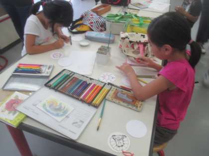 昨日に引き続き、プロのイラストレーターの山本正子さんを講師に、「コースターにイラストを描いてみよう!」と題した講座を開講していただきました。白いコースターに、マジックや色鉛筆でイラストを描きます。自分の好きな絵を思い思いに描いたり、先生の見本などを見て描いたりして、自由にコースター作りを楽しみました。