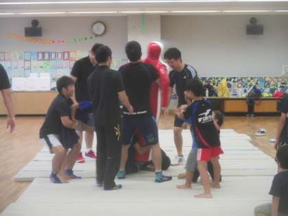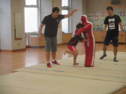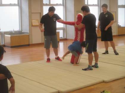 レスリングの講座では、人型のマットを使ってのタックルの練習を繰り返しました。最後にコーチたちとマットの上でゲームをして、盛り上がりました。この中から、将来オリンピックでメダルを獲得する選手が生まれるといいですね。