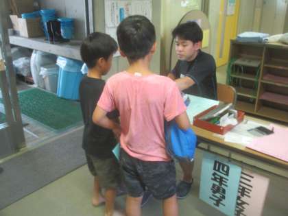 今日も早朝から水泳指導で来校した子どもたちが、受付に並んで手続きをしています。今朝は一段と蒸し暑く、プールに入るととても気持ちよいと思います。今日もしっかり泳いで、1日を元気にスタートしましょう。