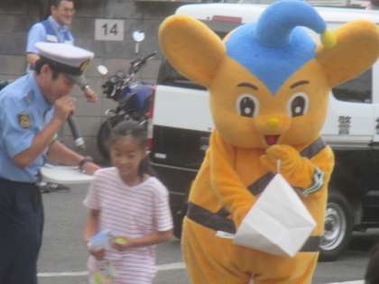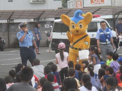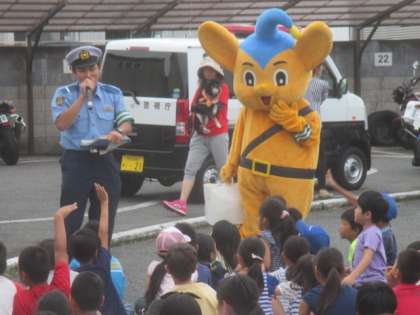 自転車の乗り方について、お巡りさんからお話をいただき、さらに豪華景品をかけてのクイズ大会が行われました。子どもたちは、積極的に手を挙げて答え、正解者にはピーポくんからプレゼントが贈られました。