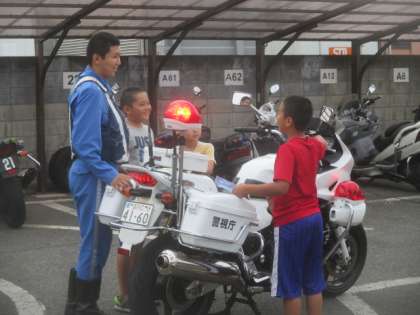 最後に白バイやミニパトに乗ったり、ピーポくんと握手したりして、楽しい交通安全教室は終了しました。関係者の皆様、企画や準備などありがとうございました。子どもたちは夏休みも交通安全に気をつけて、元気に過ごしてほしいと思います。上北沢自動車学校でのラジオ体操は、30日(日)まで行われています。
