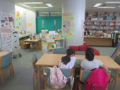 夏休みの間に、少し図書室もリニューアルしました。本の紹介コーナーが増えて、さらにゆったりくつろぐスペースも作りました。水泳指導前の子どもたちが、のんびり過ごしています。ぜひ、立ち寄ってみてくださいね。
