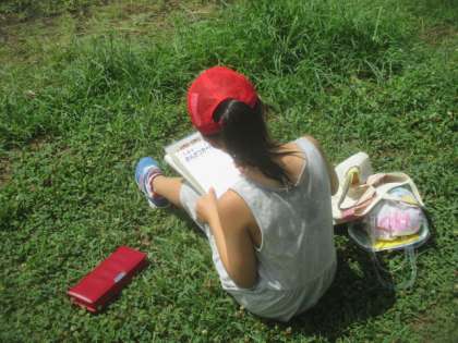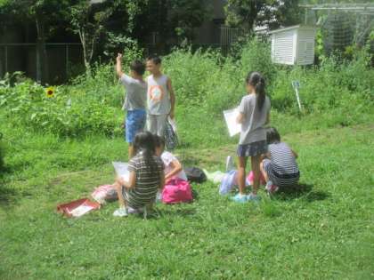 水泳指導の後、3年生は、学級園で植物の観察の宿題をしていました。ひまわりの生長の記録をカードに書き、感想をまとめていました。暑いので、水分補給をしながら、無理のないようにしてくださいね。