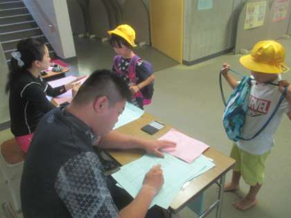 1週間の始まりの月曜日。今朝も早くからプールで学校にやって来た子どもたちが、受付に並んでいました。今日は、気持ちのよい青空の下で泳げそうです。1回目は低学年です。今日もたくさん泳いでくださいね。