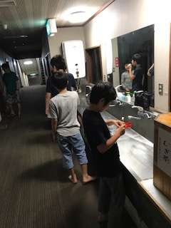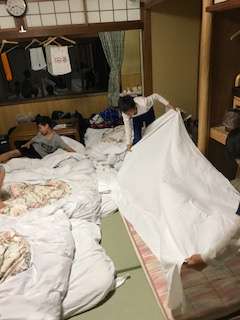 宿舎に戻り、就寝の準備をします。協力して布団を敷いたり、歯みがきをしたりしました。班長は班長会議で、今日の反省と明日の確認などをしました。