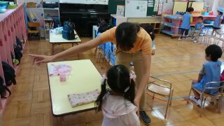 久しぶりの幼稚園です。一つ一つ思い出しながら、手洗い、うがいやコップの準備などのお仕度をしていました。